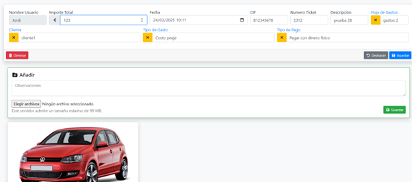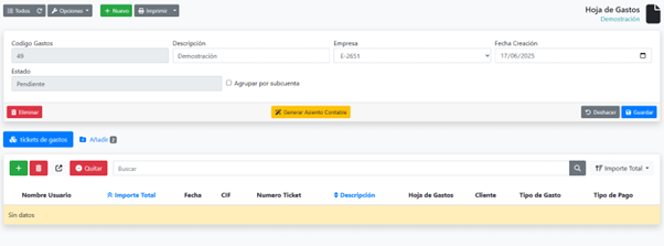 Una vez hemos creado una hoja de gastos aparece abajo para adjuntarle los tickets de gastos que no tengan una hoja de gastos añadida(por eso antes no hemos tocado ese campo ya que se añadirá solo al adjuntar el ticket).