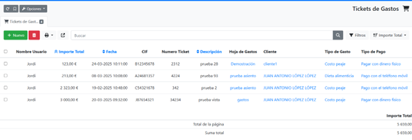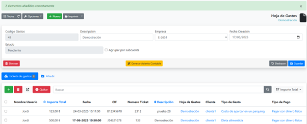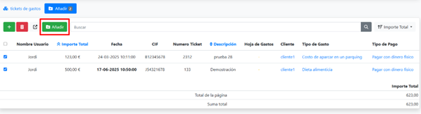 Si después de añadir algún ticket de gastos se quisiera quitarlo es tan fácil como marcarlo y darle a quitar.