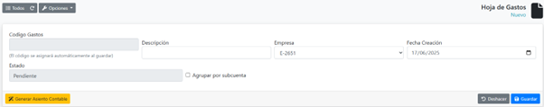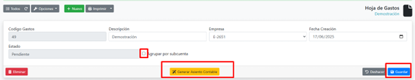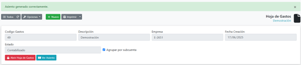 Una vez la hoja de gastos vuelve a estar abierta desmarcamos el check box de agrupar, guardamos y le damos a generar asiento contable una vez más. Tal y como se puede ver en la próxima imagen el check box ahora esta desactivado y al darle al botón de ver asiento podremos ver las partidas desglosadas