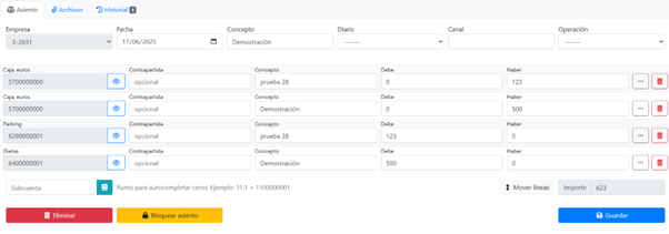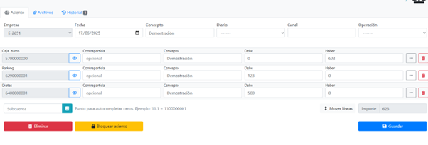 Si le damos al botón de ver asiento nos llevaría a ver el asiento que se ha generado desde esta hoja de gastos. En este caso al haber agrupado por el código de subcuenta solo nos ha agrupado el haber porque son los únicos códigos que coinciden.