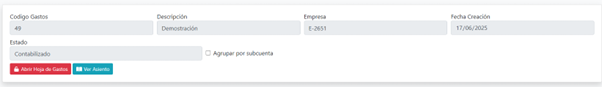Ahora que ya tenemos tickets de gastos en nuestra hoja de gastos es hora de generar un asiento y lo haremos con el botón de generar asiento contable que ya se ha visto en anteriores imágenes. Una vez hacemos click nos generará un asiento contable de los tickets que hemos añadido. Además de que ahora la hoja de gastos en la que se ha generado el asiento ya no se puede modificar y el estado pasa a contabilizado. Cuando pasa esto el botón de generar asiento contable desaparece y aparecen 2 botones más uno para abrir el asiento (lo elimina para poder volver a editar hoja de gastos) y otro para ver el asiento generado. En esta parte es importante escoger cómo queremos que se nos guarde el asiento ya que hay 2 formas. Se puede hacer que se guarde de forma agrupada por el código de la subcuenta o de forma desglosada, para escoger cual de las 2 formas queremos es tan sencillo como hacer click en el campo checkbox y marcar o desmarcar en función de lo que se quiera. En este caso marcaremos que se agrupe.