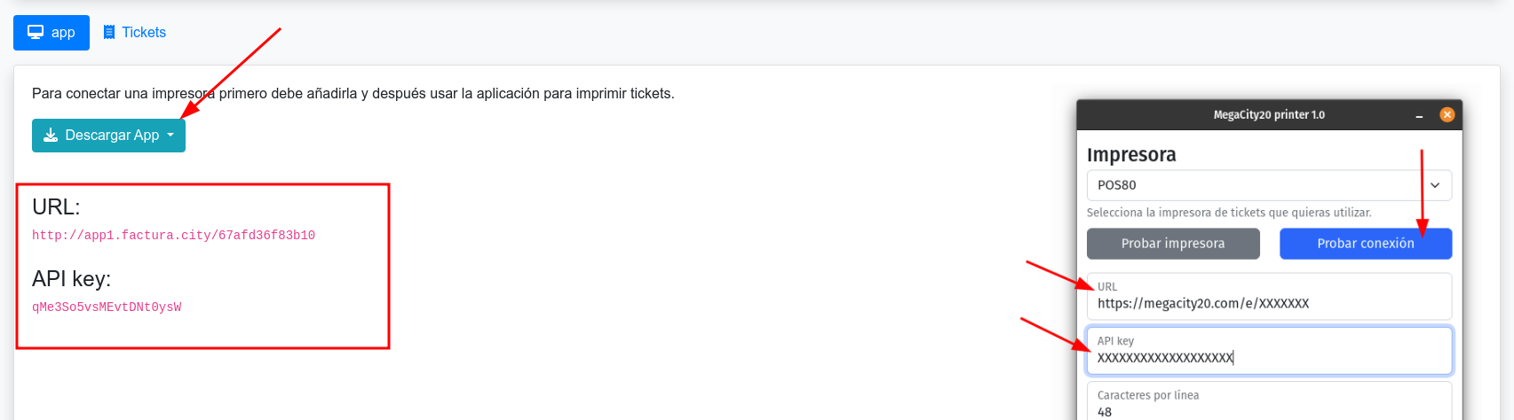 Por último, desde la misma página, debe descargar la app (mc20printer) para conectar la impresora de tickets y escribir la URL y API key asignada: