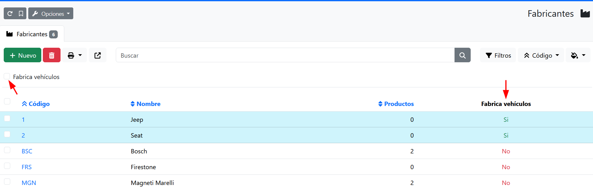 El el listado por pantalla, los fabricantes de vehículos aparecen con un fondo de color diferente al resto y tenemos la posibilidad de filtrar por dicho campo.