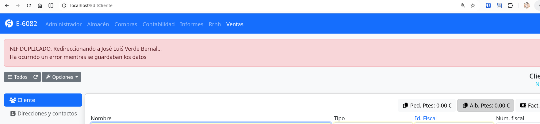 Al guardar un cliente con un NIF que ya está en la base de datos de clientes, salta una alerta, y redirecciona al cliente encontrado en dos segundos.