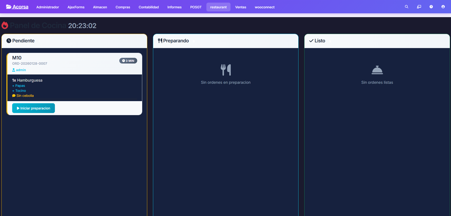 El panel de cocina permite visualizar los pedidos que se tienen que preparar, el panel de mesero se actualiza solo a cada 30 segundos, y permite ver y gestionar el estado de los productos pedidos por los clientes