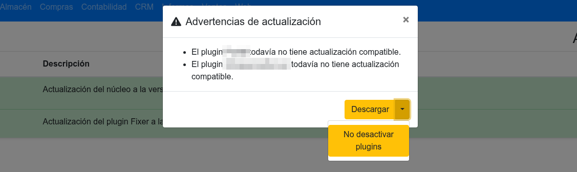 El actualizador nos avisará cuando tengamos plugins que todavía no han sido marcados como compatibles con la versión de FacturaScripts que vamos a instalar. En este caso al actualizar se desactivan esos plugins para evitar problemas, a menos que seleccionemos no desactivar plugins.