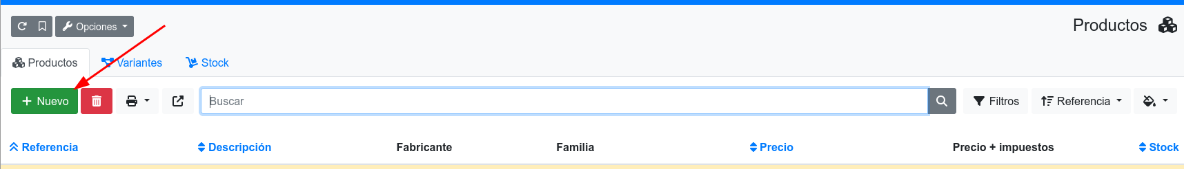 Para añadir un producto, haga clic en el botón "Nuevo" dentro del listado de productos. Se abrirá el formulario de creación, donde solo es obligatorio completar el campo Descripción. El resto de campos son opcionales.