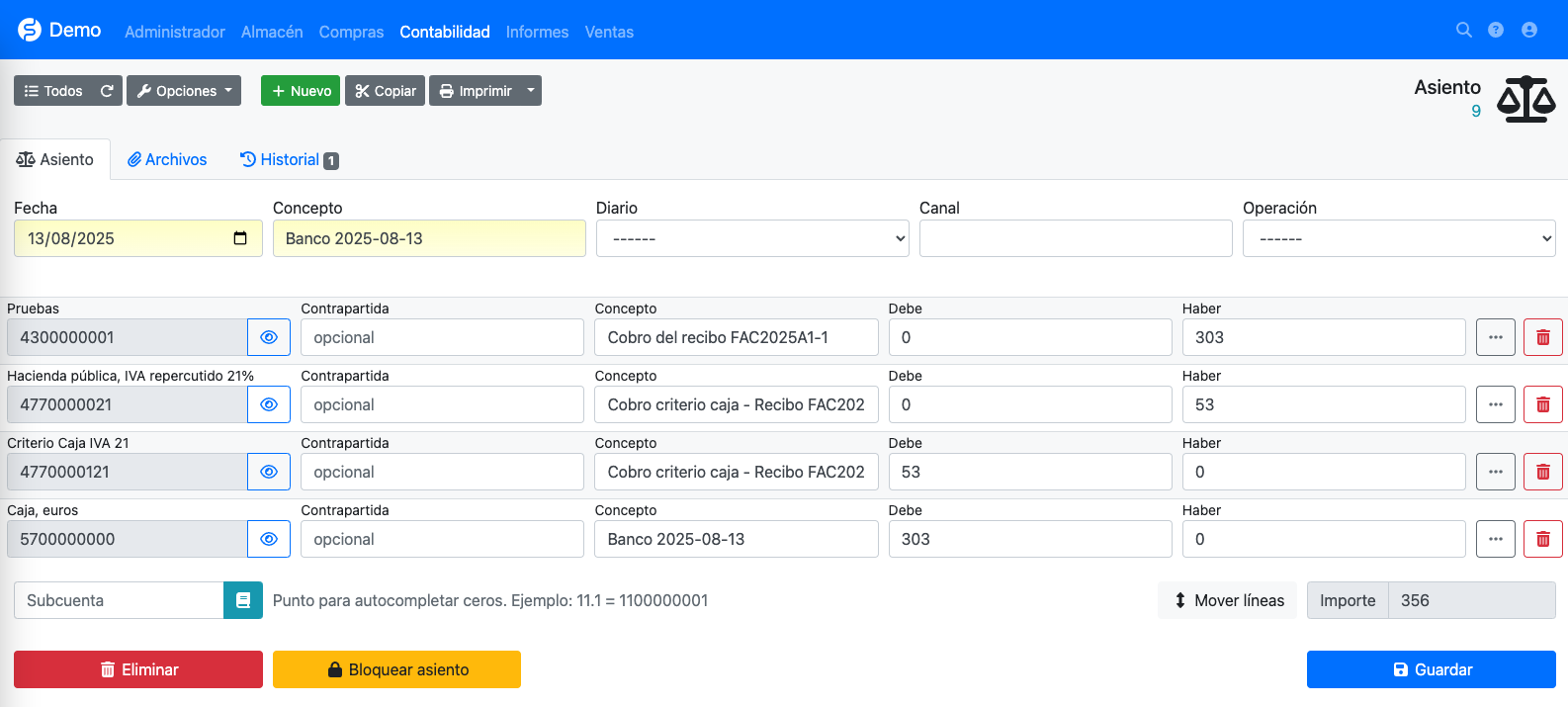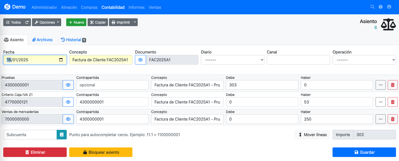 - Al confirmar la factura, FacturaScripts genera automáticamente el asiento contable, asignando los importes de impuestos a la subcuenta intermedia de criterio de caja.