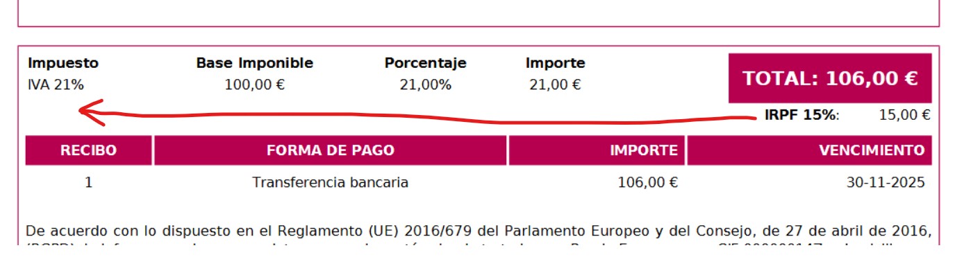 Adjunto imágenes de los ejemplos usando varias de las plantillas. En un modelo aparece en mitad de la factura y en otros aparece encima o debajo del importe total. El tema de los impuestos es algo importante y que el cliente final no tenga problemas de identificarlo ya que repercute en el emisor.